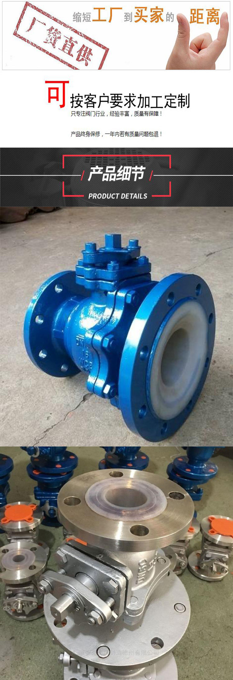 产品概述: FQ41F46衬氟放料球阀属法兰连接手动直通式浮动球球阀,其采用氟塑料衬里技术,阀体采用熔模精密铸造,强度高、外观光洁,与液体接触的过流部件为氟塑料PTFE(F4),适用在-50℃~150℃的浓度的王水、硫酸、盐酸、 ...